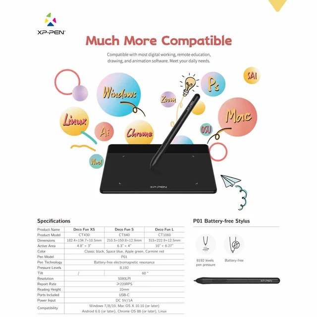 کمپانی XP PEN به عنوان بزرگترین تولید کننده قلم نوری، سری جدید محصولات خود را با عنوان Deco Fun Series روانه بازار کرده است. کلیه قلمهای سری Deco Fun، دارای حداکثر رزولوشن و وضوح (5080lpi) و بیشترین دقت و حساسیت شناسایی فشار (8192level) هستند. این سری محصولات با توجه به دقت و حساسیت و قابلیت فنی برای انواع کاربردهای ساده تا کاملا حرفهای مناسب هستند. قلمهای سری Deco Fun از نوع سبک، باریک و بدون باتری هستند و توسط پورت USB-C از طریق کابل به کامپیوتر متصل میشوند. از مزایای شاخص و چشمگیر سری Deco Fun، سازگاری کامل آن با انواع سیستمهایعامل Android, Chrome OS, Linux, Windows, and Mac OS است که امکان اتصال به انواع سیستمها را میسر میکند. این مدل قادر به تشخیص زاویه قلم تا 60 درجه بوده که این قابلیت، امکان ایجاد افکتهای خاص برای مصارف حرفهای در طراحی و تصویرپردازی را فراهم کرده است. طبق اعلام کمپانی سازنده، این سری محصولات با انواع برنامهها از جمله Microsoft Office, Zoom, Skype, Adobe, Photoshop, SAI و بیشتر، سازگاری دارد. گفتنی است این سری محصولات از نوع Plug & Play بوده و به محض اتصال به کامپیوتر، فعال میشوند. در این مدل برای استفاده از قابلیت تشخیص فشار، درایور محصول طی 3 مرحله ساده و کوتاه، قابل نصب است. هر بسته حاوی صفحه (تبلت)، قلم P01، گیره مخصوص تعویض نوک، 10 عدد نوک اضافی و یدکی قلم، دفترچه راهنما و کابل اتصال USB-C است. قلم نوری ایکس پی-پن مدل Deco Fun S CT640 میتواند یک انتخاب مفید، کارآمد و هوشمندانه برای کسانی باشد که در زمینههای ادست و اتود زنی و طراحی فعالیت دارند. این قلم دارای قدرت تشخیص زاویه قلم بوده و این قابلیت به کاربر امکان میدهد تا در نرمافزارهای گرافیکی، افکتهای خاص را تولید کند.