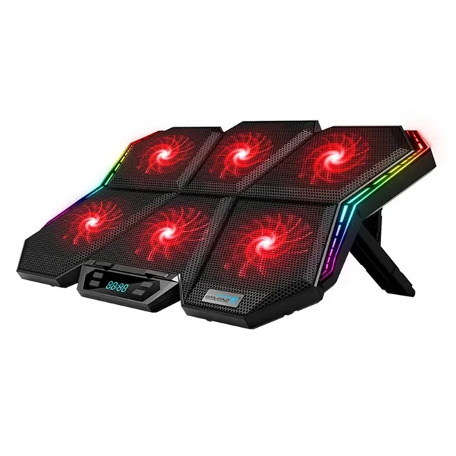 پایه خنک کننده لپ تاپ کول کلد مدل K40 ساخته شده از ABS با کیفیت و فلز میباشد. وظیفه تهویه در این کول پد را 6 فن مجزا قدرتمند با ابعاد 60x60x15 میلی متری به عهده دارند. همچنین این کول پد دارای نورپردازی RGB با 12 حالت پیش فرض نورپردازی میباشد. بر روی این کول پد یک پنل کنترل دیجیتال که وظیفه کنترل تعداد فن روشن، سرعت فن و نورپردازی را به عهده دارد تعبیه شده است. سرعت چرخش فن این دستگاه 2900±10%RPM(5V) می باشد در نتیجه عملکردی موثر در خنک کنندگی لپتاپ شما دارد. به لطف دمندگی بالای فن های قدرتمند، این کول پد گزینه مناسبی برای بازی های رایانه ای، کارهای گرافیکی و طراحی ها سنگین می باشد. این کول پد همچنین دارای پایه های تنظیم ضد لغزش با 7 ارتفاع مختلف است تا در نتیجه از نظر ارگونومیک گردن و کمر شما را در برابر تاثیرات منفی کار طولانی مدت با رایانه محافظت کند. بر روی این کول پد دو عدد درگاه USB 2.0 تعبیه شده است و در کنار تامین انرژی مورد نیاز برای کارکرد دستگاه، شارژ سایر دستگاه های دیجیتالی از طریق درگاه دوم ممکن است. این پایه خنک کننده مناسب برای لپ تاپ های با ابعاد تا 17 اینچ است.