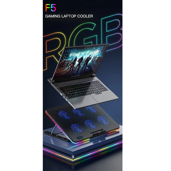 پایه خنککننده لپتاپ کول کلد مدل F5-RGB با ۶ فن قدرتمند و نورپردازی RGB، انتخابی عالی برای گیمرها و کاربران حرفهای است. این کول پد با طراحی ارگونومیک، قابلیت تنظیم زاویه، و وجود هولدر موبایل، تجربه کار با لپتاپ را راحتتر و جذابتر میکند.